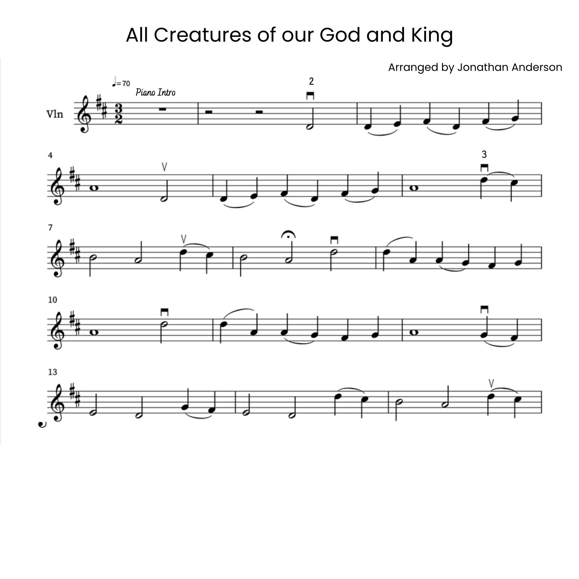 This is a digital download of the violin sheet music for All Creatures of Our God and King.